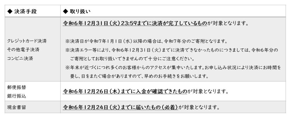 なお、令和6年12月16日(月曜日)以降に払い込みいただいた方への寄附金受領証明書は、令和7年1月以降の発送となります。