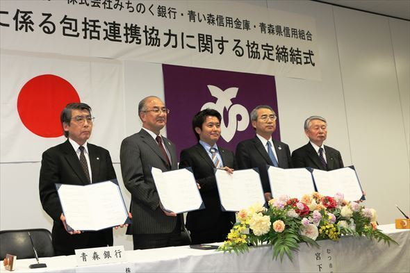 市と株式会社青森銀行、株式会社みちのく銀行、青い森信用金庫及び青森県信用組合は、地方創生の各分野において相互に協力し、包括的な連携の下に地域活力の増進と地域経済の発展に寄与することを目的として、平成28年4月11日に「地方創生に係る包括連携協力に関する協定」を締結しました。