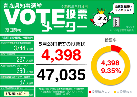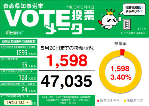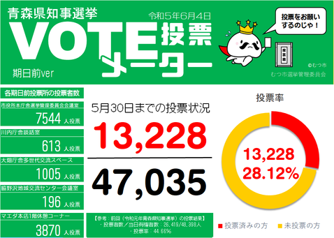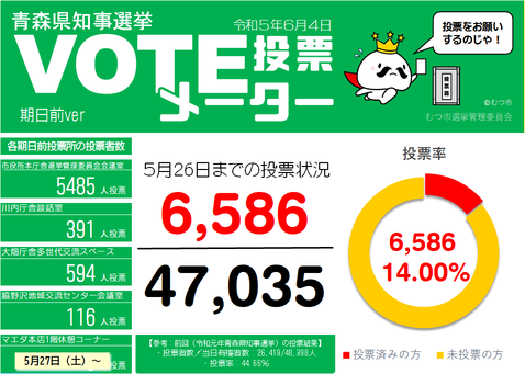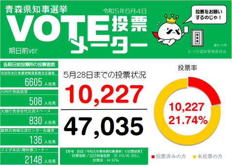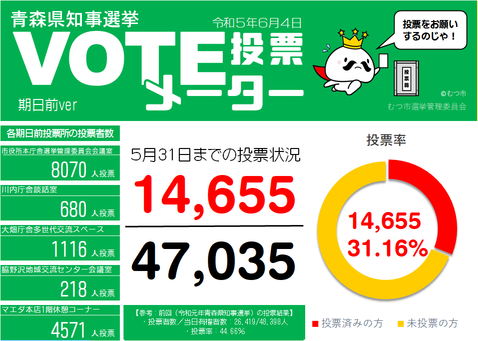 5月31日(水)の投票者数:むつ 526人、川内 67人、大畑 111人、脇野沢 22人、マエダ 701人