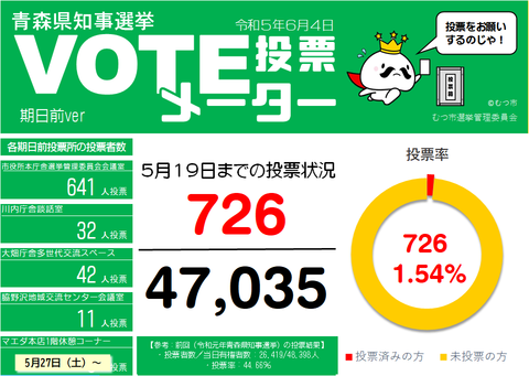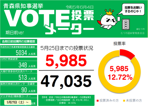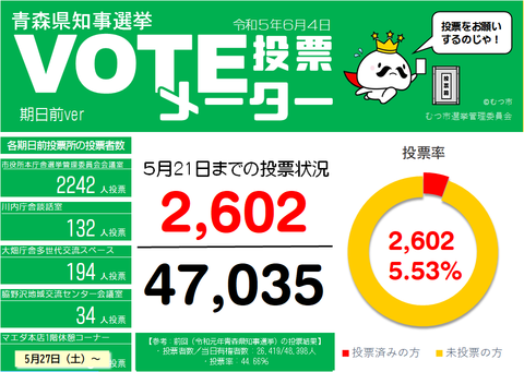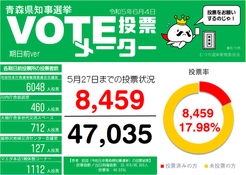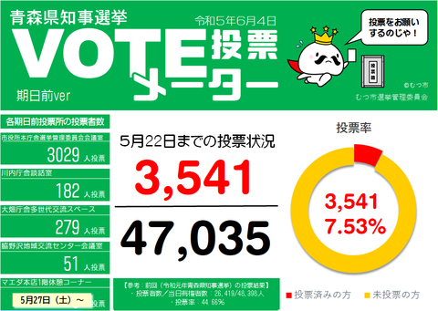 5月27日(土)の投票者数:むつ 563人、川内 69人、大畑 118人、脇野沢 11人、マエダ 1,112人