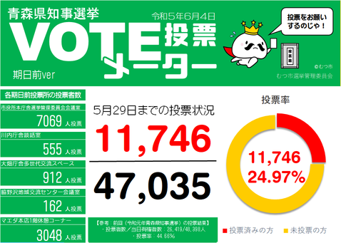 5月25日(木)の投票者数:むつ 565人、川内 46人、大畑 73人、脇野沢 13人、マエダ--人