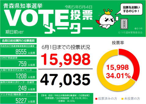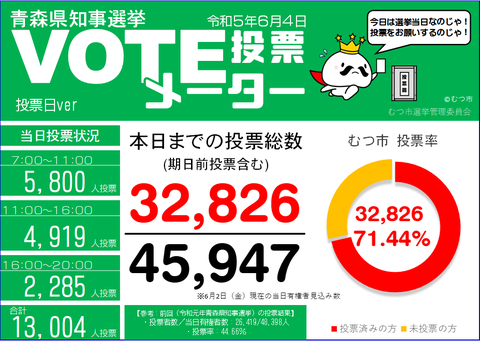 むつ市の投票者数は33,715人で、投票率は73.33%となりました!