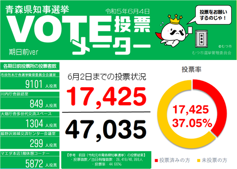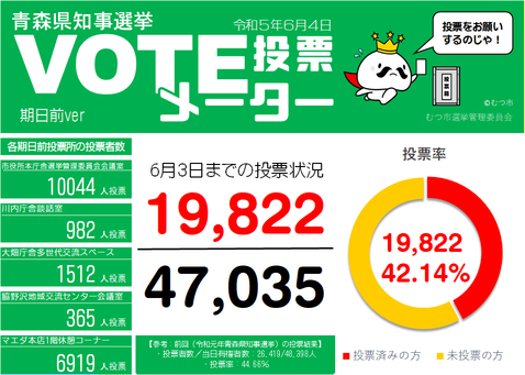 6月3日(土)の投票者数:むつ 943人、川内 133人、大畑 208人、脇野沢 66人、マエダ 1,047人