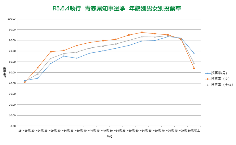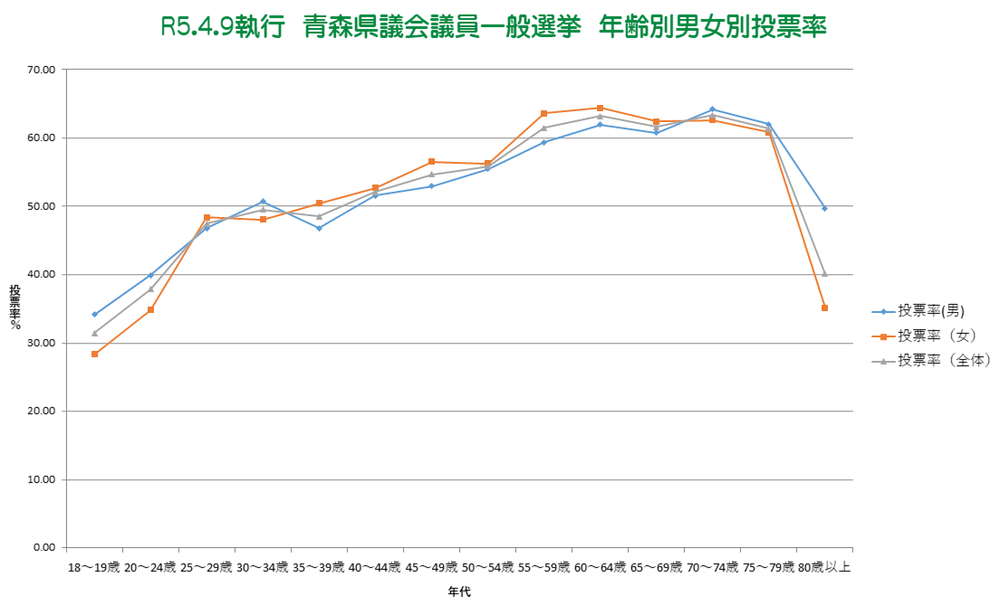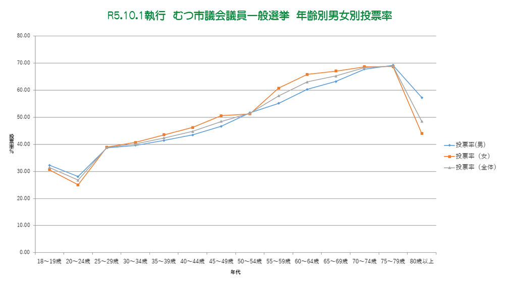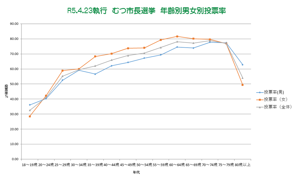 過去にむつ市で執行された選挙の年齢別男女別投票率です。