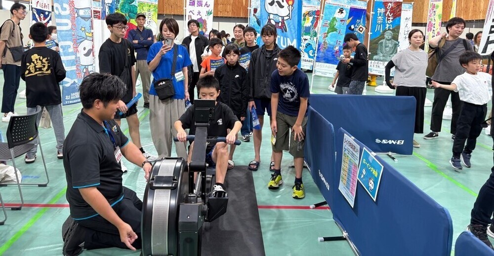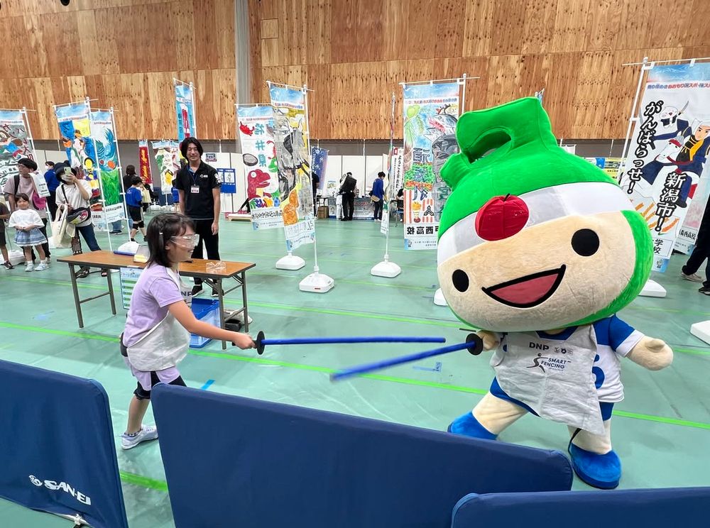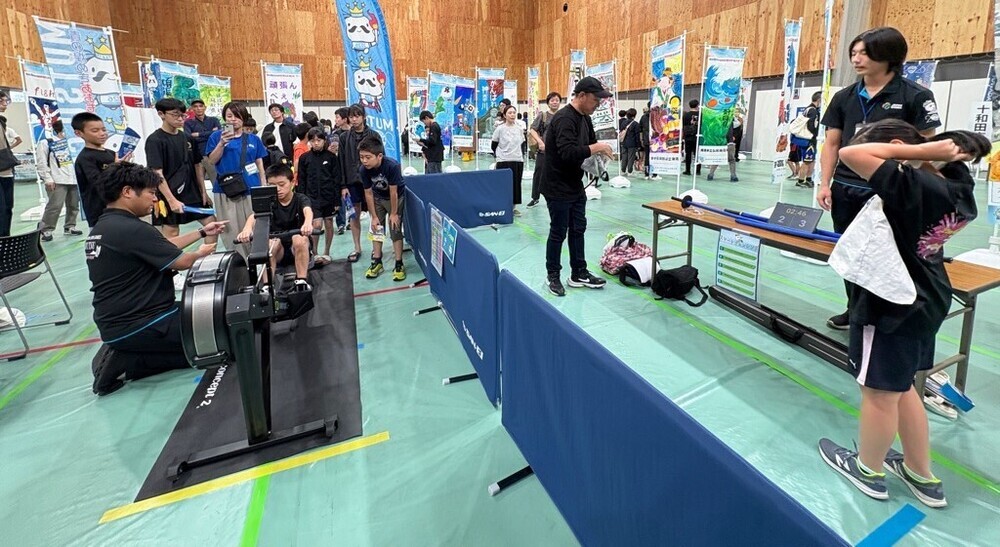 競技体験ブースではローイング競技のトレーニングで使用するエルゴメーターとスマートフェンシングを設置。アップリート君もスマートフェンシングを体験しに来てくれて、とても賑わっていました。