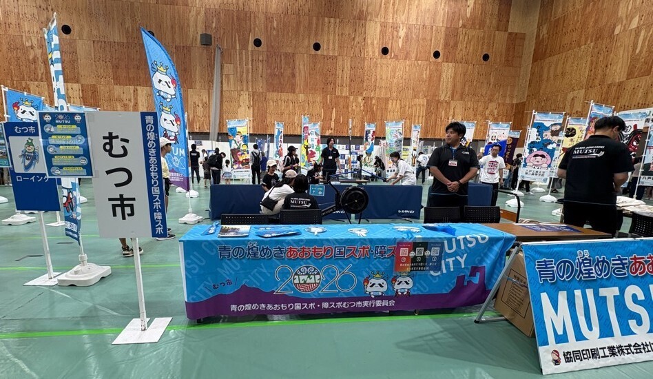 9月21日(日)に青森市カクヒログループスーパーアリーナにて青の煌めきあおもり国スポ・障スポ開催1年前イベントが開催され、むつ市実行委員会として競技体験ブースとPRグッズコーナーを出展しました。