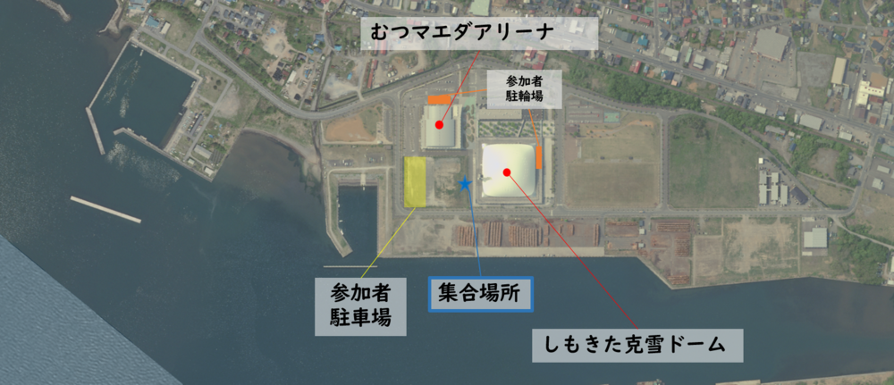 5.自転車でお越しの方は、参加者駐車場ではなく、むつマエダアリーナ及び眞心堂ウェルネスパークの駐車場をご利用ください。