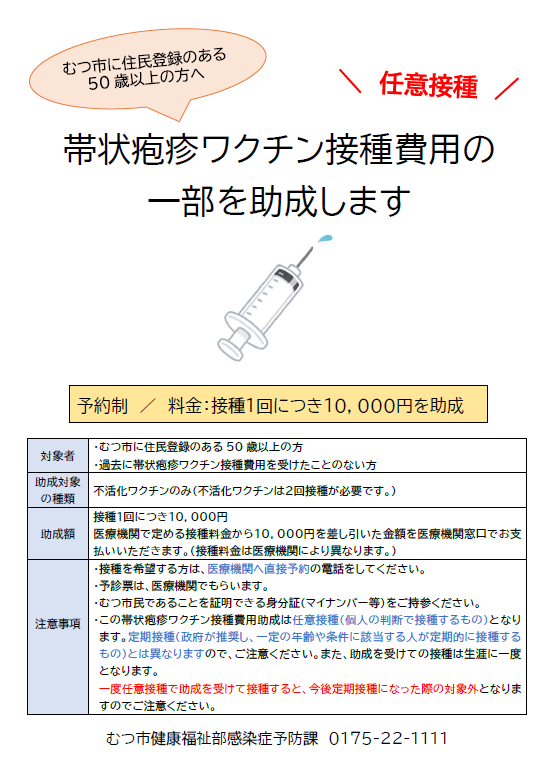 むつ市に住民登録のある50歳以上の方で、市内指定医療機関で帯状疱疹ワクチン(不活化ワクチン)の接種を希望される方へ接種費用の一部助成を行います。(ただし、過去に帯状疱疹ワクチン接種費用助成を受けたことがある方は対象外です。)