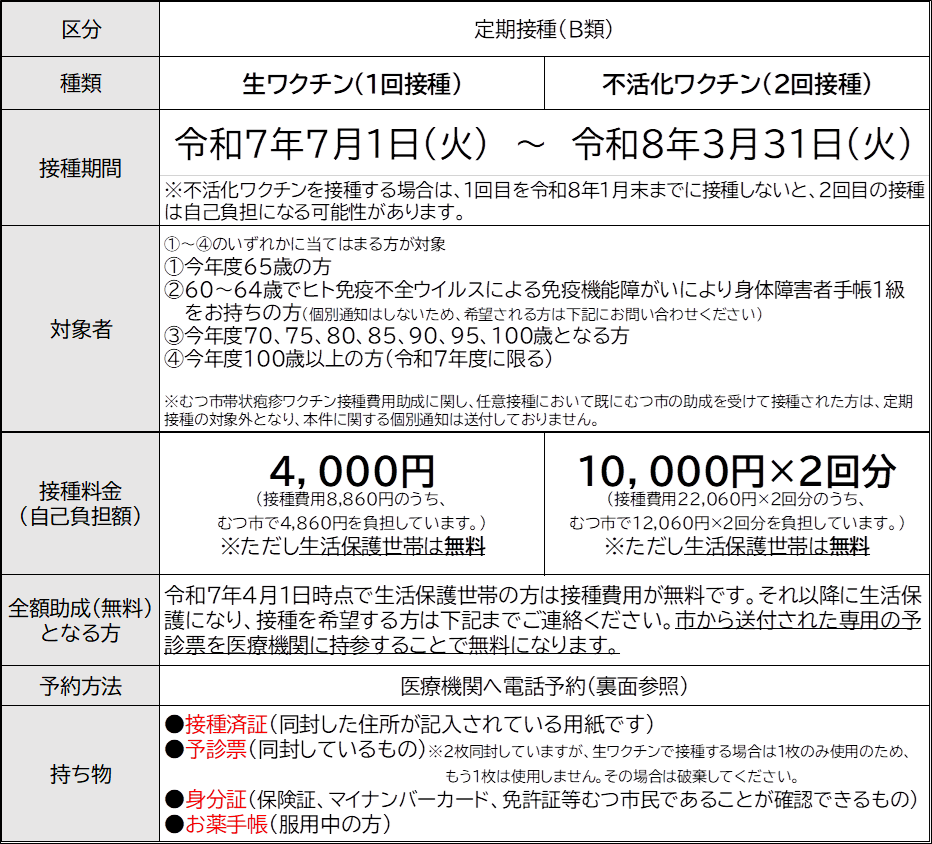 厚生労働省の方針により、令和7年4月から帯状疱疹ワクチンが新たに定期接種(B類)として追加されました。それに伴い、むつ市でも定期接種として受けられるようになります。