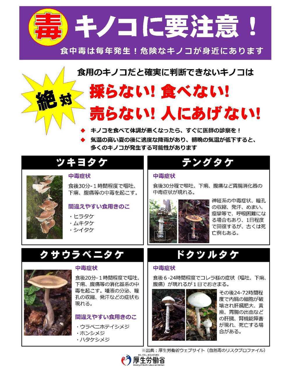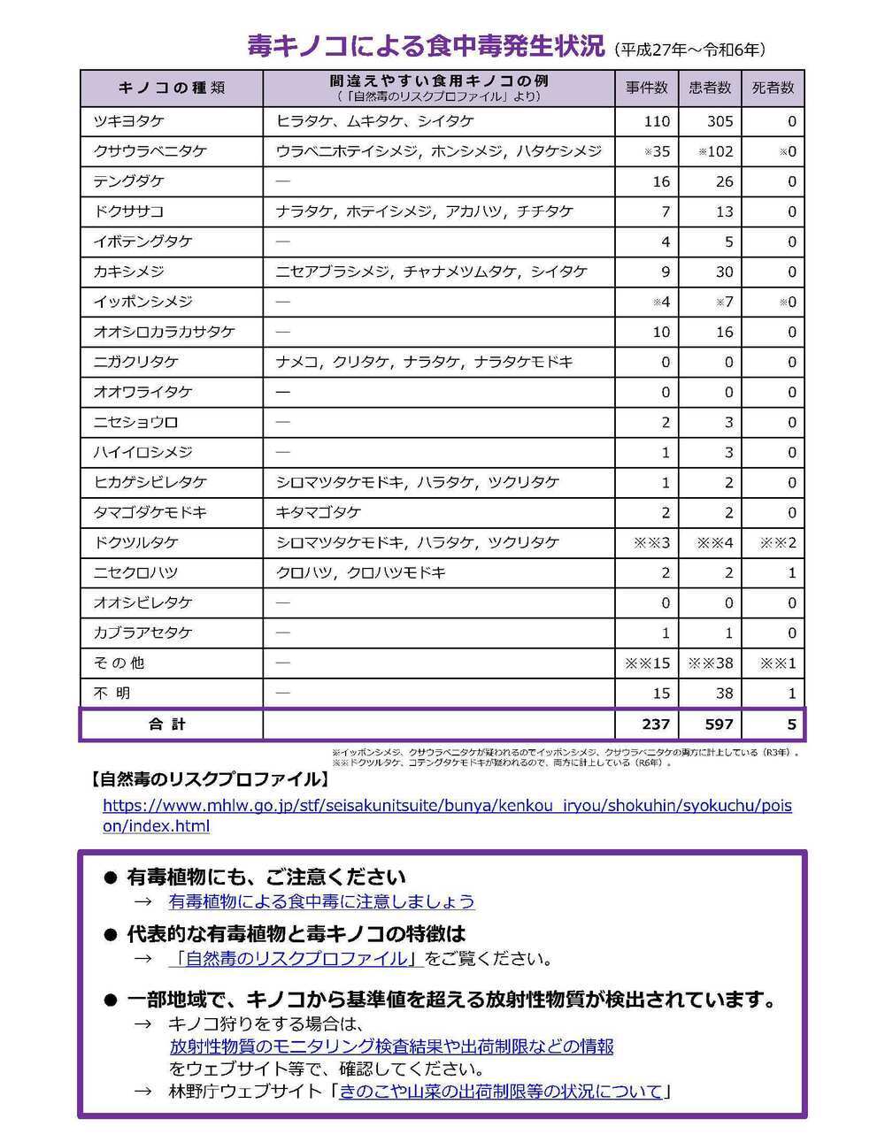 毎年、夏の終わりから秋にかけて、毒キノコを食用キノコと誤認して採取し、食べてしまう食中毒が多く発生しています。令和6年は、ツキヨタケ、オオシロカラカサタケ、ドクツルタケなどの毒キノコの誤食による食中毒の事例が報告されています。