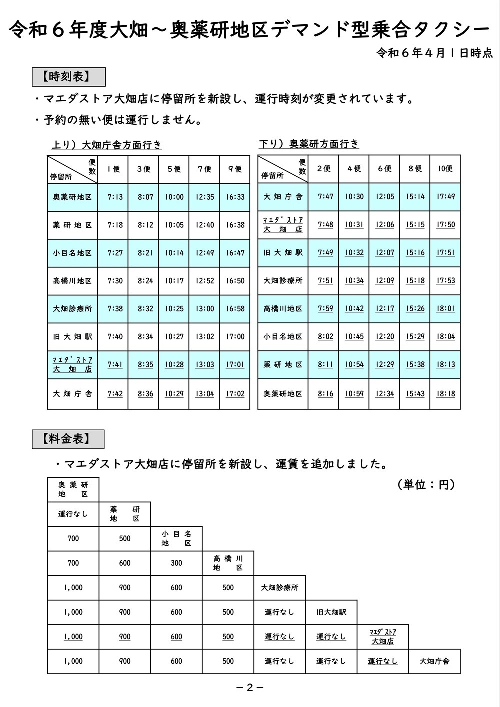 廃止された路線バス『薬研・小目名線』に代わる交通手段として、完全予約制の『デマンド型乗合タクシー』を運行しています。