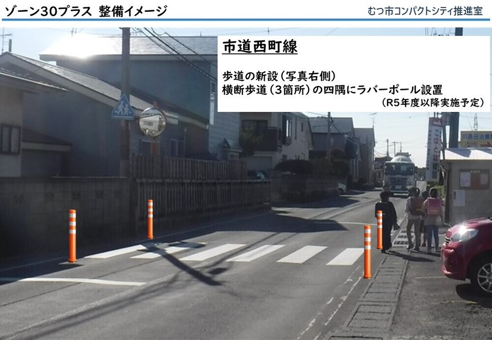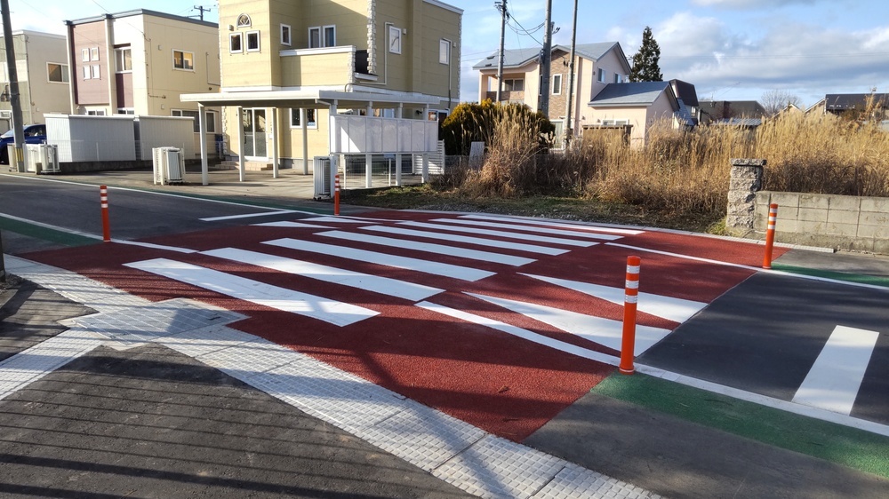 歩道を新設し、横断歩道(3箇所)の四隅にラバーポールを設置予定です。