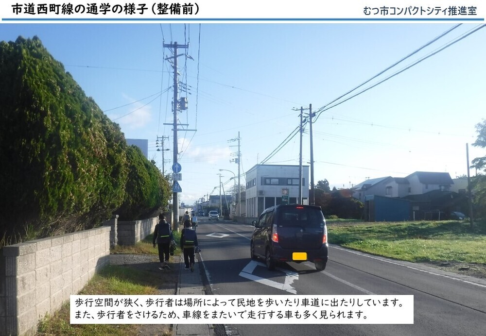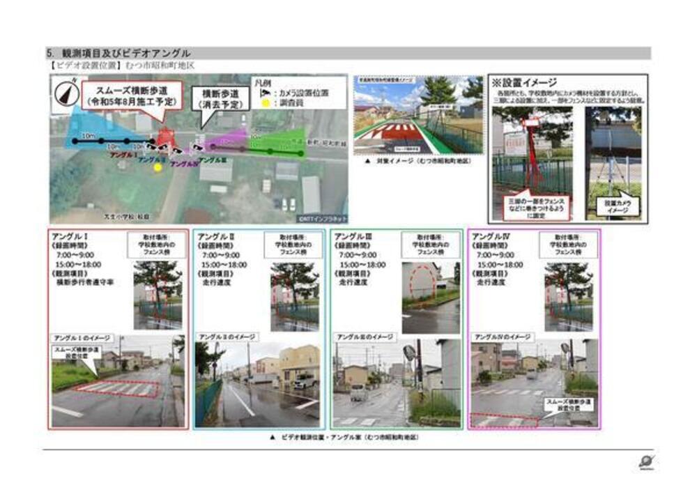 苫生小学校北側の市道新町昭和町線にスムーズ横断歩道を設置するにあたり、設置前と設置後の比較検討をおこなうため、国土交通省青森県河川国道事務所が事前調査を実施します。
