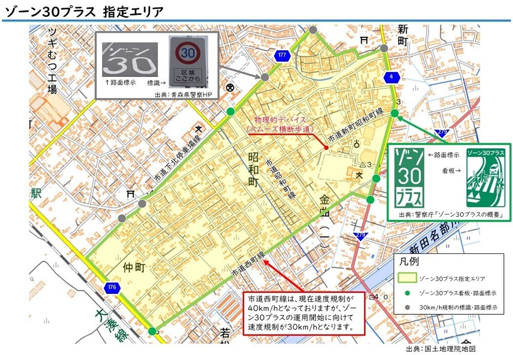 また、青森県警察では、エリア内に標識、路面表示などの設置を予定しています。