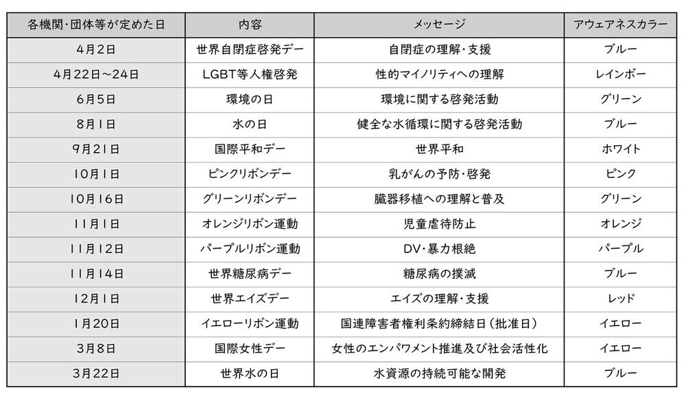 アウェアネスカラーとは、社会運動に関するシンボルカラーの装着や、ランドマークとなる建造物や橋梁などをシンボルカラーにライトアップしたりすることで、その運動への支援・賛同を示す色のことです。