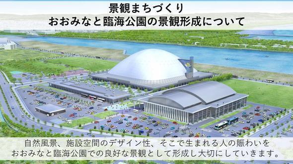 おおみなと臨海公園では公園から見える自然風景、総合アリーナやPark-PFIの整備よる施設空間のデザイン性、そこで生まれる人の賑わいや活動が交わり溶け込み合いをみせる良好な景観を大切していくこととしています。
