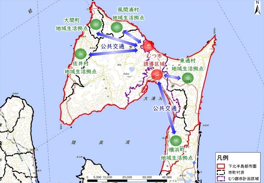 「下北圏域定住自立圏」、「下北地域公共交通総合連携協議会」および「JR大湊線活性化協議会」を踏まえ、都市計画区域(立地適正化計画区域)を持つむつ市を中心とし、都市計画区域外となる横浜町、大間町、東通村、風間浦村および佐井村を構成市町村とします。