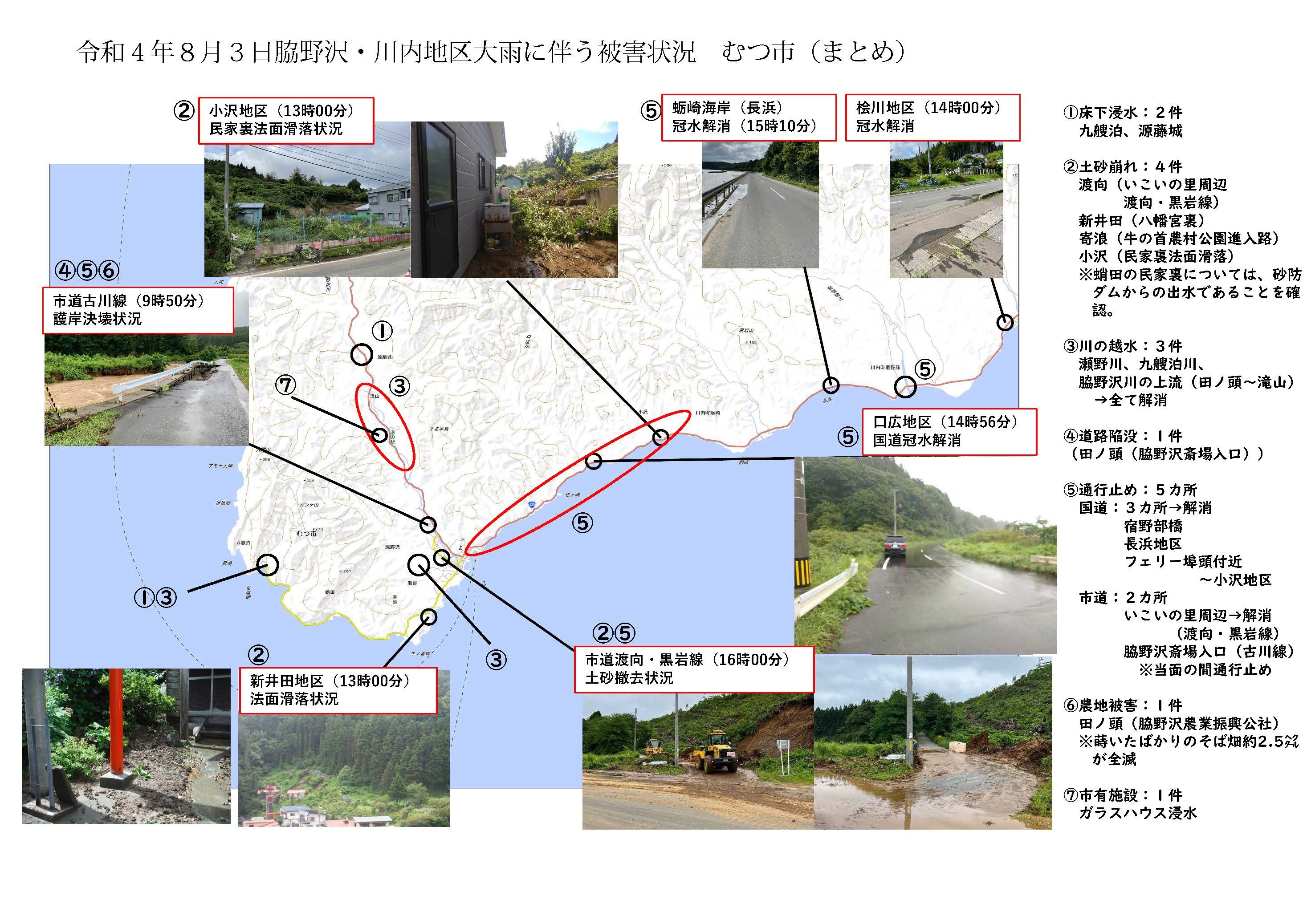 脇野沢地区口広川付近が冠水の影響により通行止めとなっています。