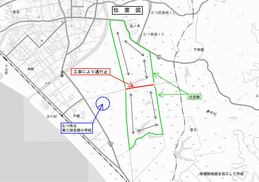青森県にて実施している国道279号線(むつ南バイパス)道路改良工事に伴い、「市道酪農2号線」が一部通行止めとなりますので、工事期間中は迂回路をご利用ください。