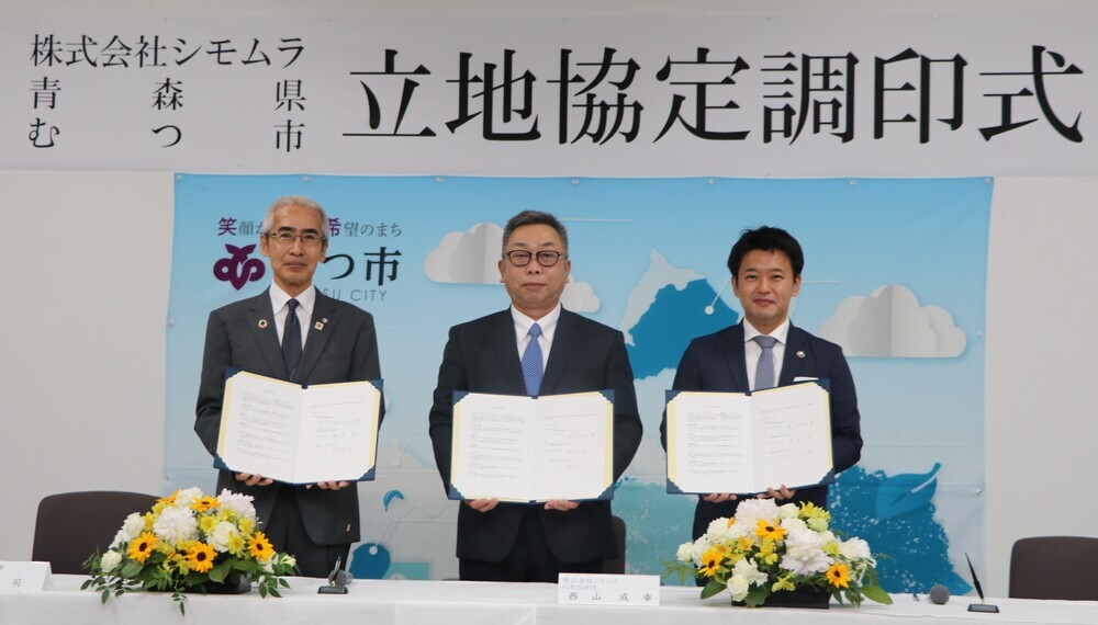 令和4年6月23日に、繊維製造業の(株)シモムラ、青森県、むつ市の三者で「企業立地に関する基本協定」を締結いたしました。