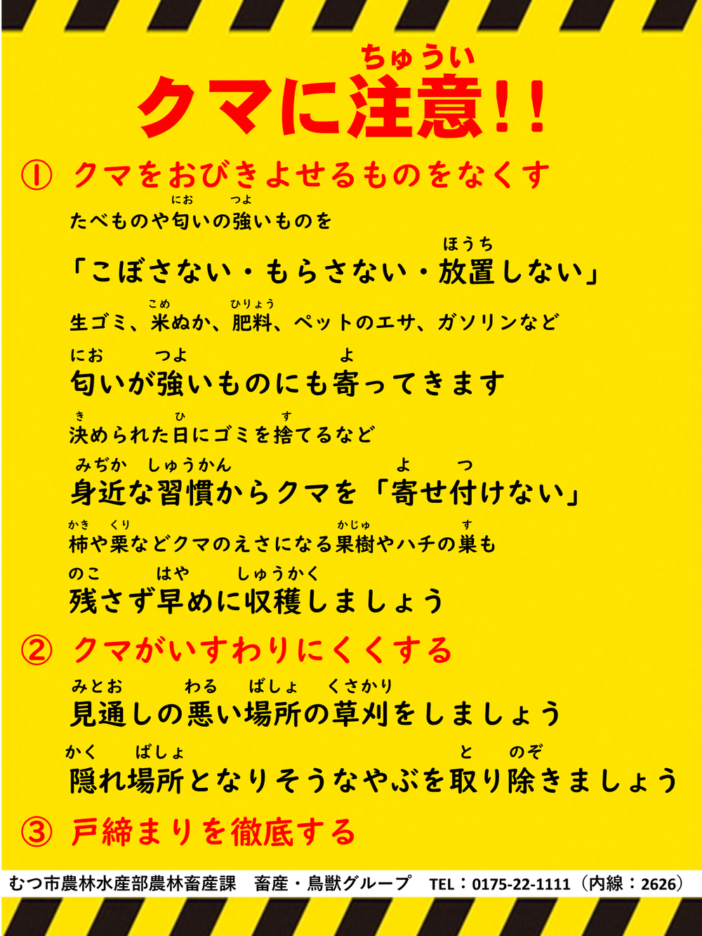 むつ市内におきましても、今後、目撃情報の増加が予想されます。