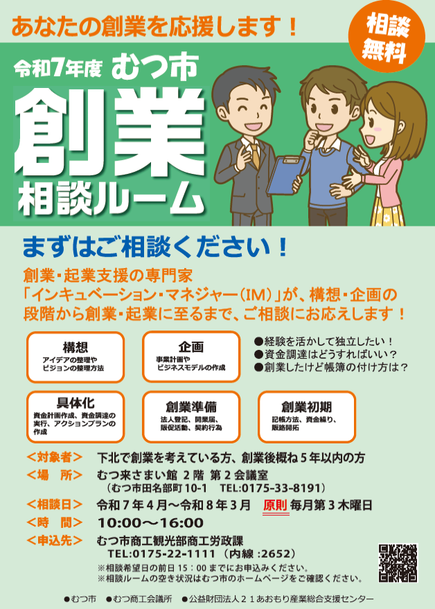 むつ市では創業・起業を考えている方や、創業後概ね5年以内の方を対象に専門家へ無料で相談できる「むつ市創業相談ルーム」を開設しています。