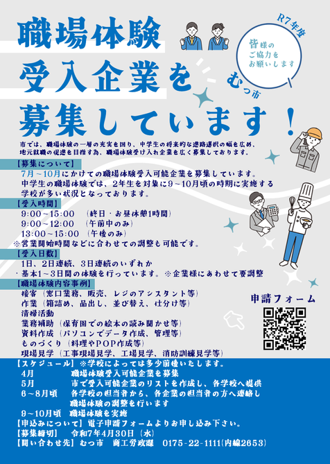 7月~10月にかけての職場体験受入可能企業を募集しています。