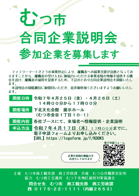 ファミリーマートさとうの事業停止により、離職者への就業支援が急務となっておりますことから、離職者の受け入れに御協力いただける事業者様の情報を提供する機会を設け、離職者の雇用を促進するため、下記のとおり合同企業説明会を開催いたします。