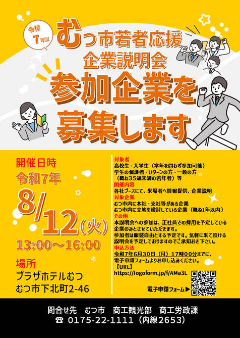 市では若者の地元就職の促進及び高校生・大学生等の若い世代に向けて、企業の魅力や仕事内容を直接伝えていただく場として、下記のとおり企業説明会を開催いたします。